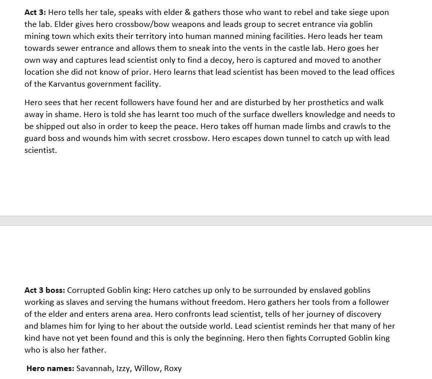The next thing to do for my story was to create a 3 act structure for the main plot points and inciting incidents for it. This meant I had to create extensive sections of my story to explain how the hero progressed through the game.